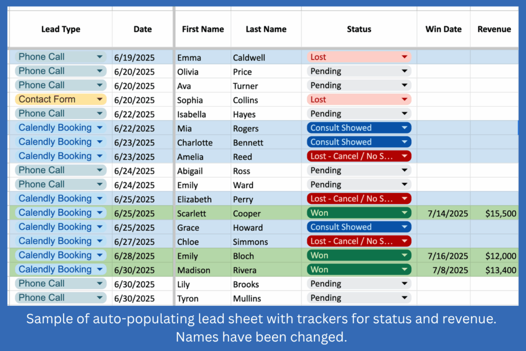 Our deep integration approach used a shared spreadsheet to show each lead, its status, booking shows and no-shows, wins, and revenue.